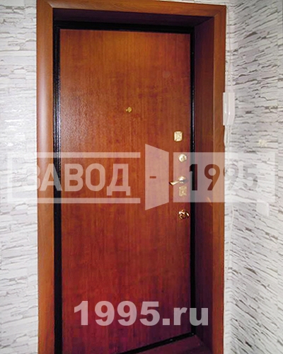 Оригинальный внешний вид – одно из достоинств этой входной двери из стали толщиной 2 мм. Внешний фасад изделия отделан ламинатом, который имитирует популярный рисунок натурального дерева. С внутренней стороны производитель оформил полотно дутой винилискожей. Объемная искусственная кожа придает двери уютный и необычный внешний вид. Важное преимущество кожзама, как отделочного материала, - усиление изоляционных качеств двери. Рассматриваемая входная дверь надежно защищает помещение от посторонних шумов и сквозняков.