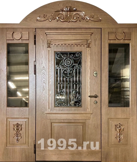 Стальная дверь с массивом дерева боковыми остекленными вставками и арочным карнизом