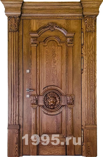 Дверь с массивом дуба, резьбой, карнизом, отбойником и зеркалом