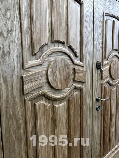 Парадная термодверь МДФ шпон с резным декором и остекленными вставками