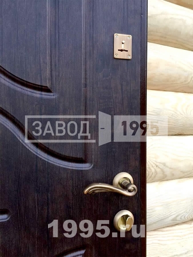 Входные двери состоят из короба, полотна, фурнитуры. Устойчивость и жесткость изделия обеспечена сталью толщиной 2 мм, а также ребром жесткости. Двери отделаны панелями МДФ темного цвета с фрезерованным рисунком. Гладкая поверхность отделки позволяет легко удалять с дверей загрязнения. Материал безопасен и не выделяет вредных веществ, он имеет бюджетную стоимость, что позволяет держать относительно невысокой конечную стоимость изделия. Двери МДФ выглядят стильно. Также в качестве отделки применен массив дерева.