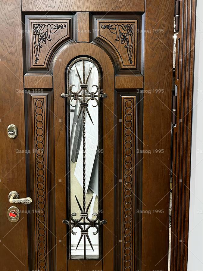 Дверь с отделкой МДФ, 3х-камерным стеклопакетом и кованой решеткой