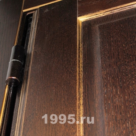 Дверь изготовлена из стали толщиной 2 мм, снаружи отделана темной панелью из филенчатого МДФ с окантовкой, внутри – фрезерованная панель из МДФ ПВХ. Установлено три петли диаметром 20 мм и два врезных замка золотого цвета. Модель отлично подойдет для установки в качестве входной двери для загородного дома.